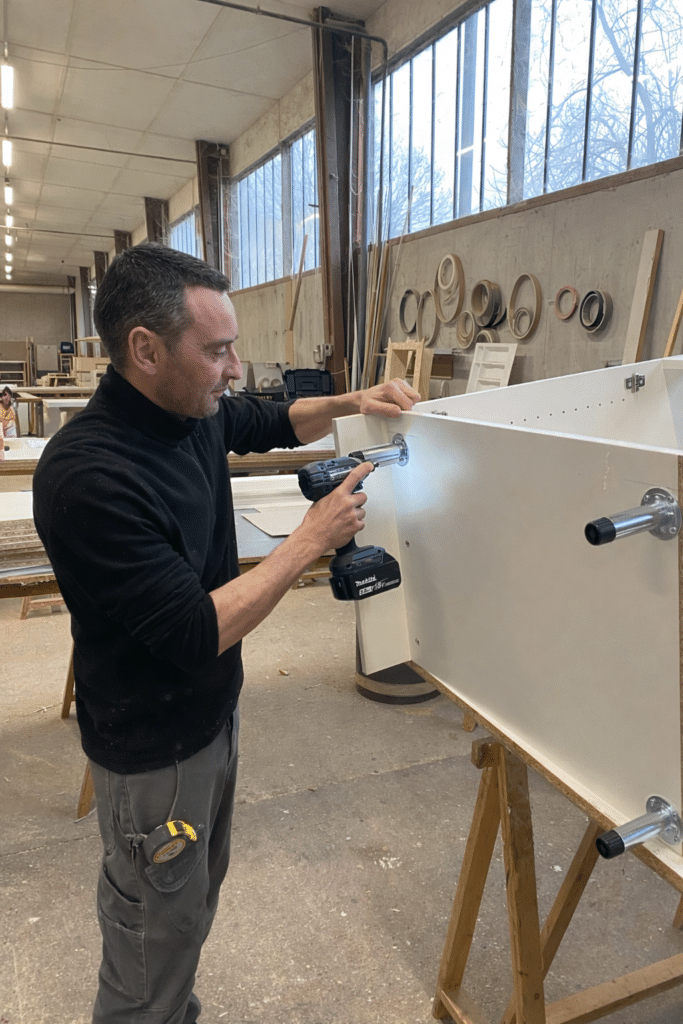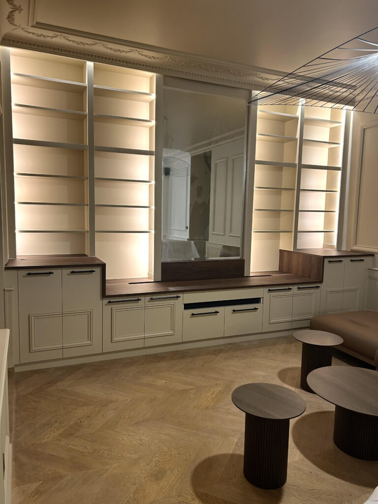 Nous réalisons également des meubles sur mesure pour vos projets de bureaux, banques d’accueil, cuisines, dressings, bibliothèques ou tout autre réalisation menuisée.